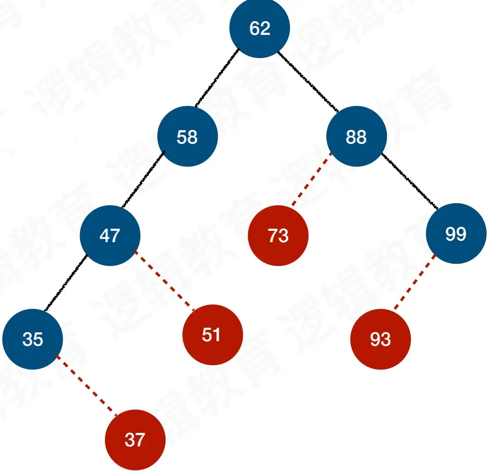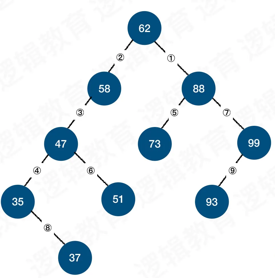 通过这种方式,我们就可以创建一颗二叉树了,并且当我们进行中序遍历的时候,就可以得到一个有序的序列{35,37,47,51,58,62,73,88,93,99},这棵树就是我们所说的二叉排序树。