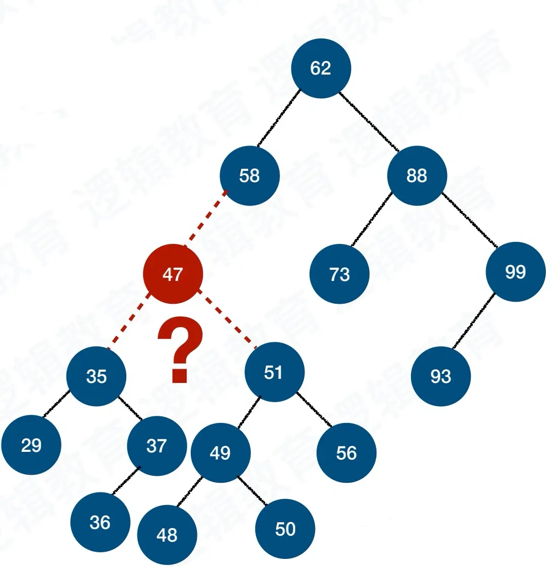 - 第四个元素47<62,找到结点62的左子树根结点58,47<58,结点47左右结点58的左孩子;