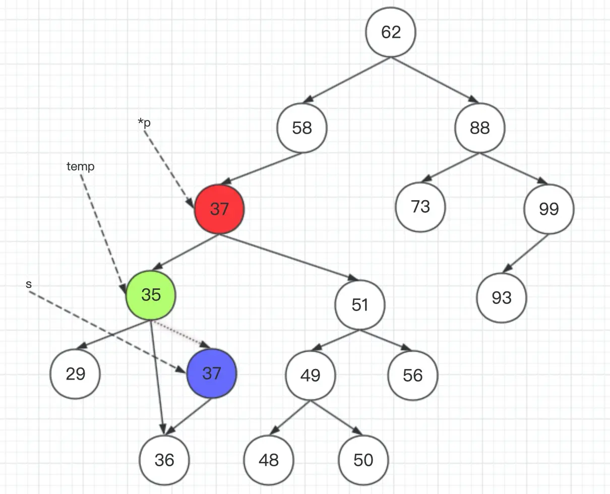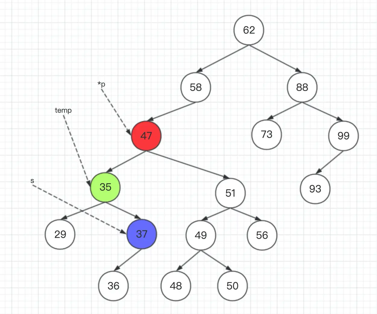 - 找到47结点后,*p指向47,s指向47左子树的根结点35,temp指向s的前驱结点47