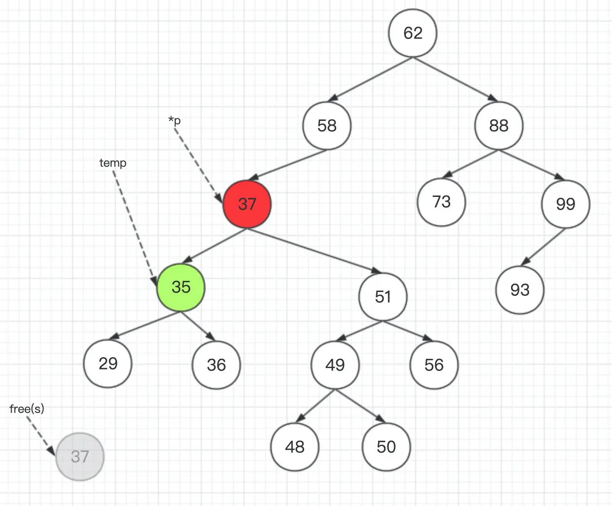 - (*p)->data = s->data,断开temp->rChild与s的关系,将temp->rChild与s->lChild连接起来