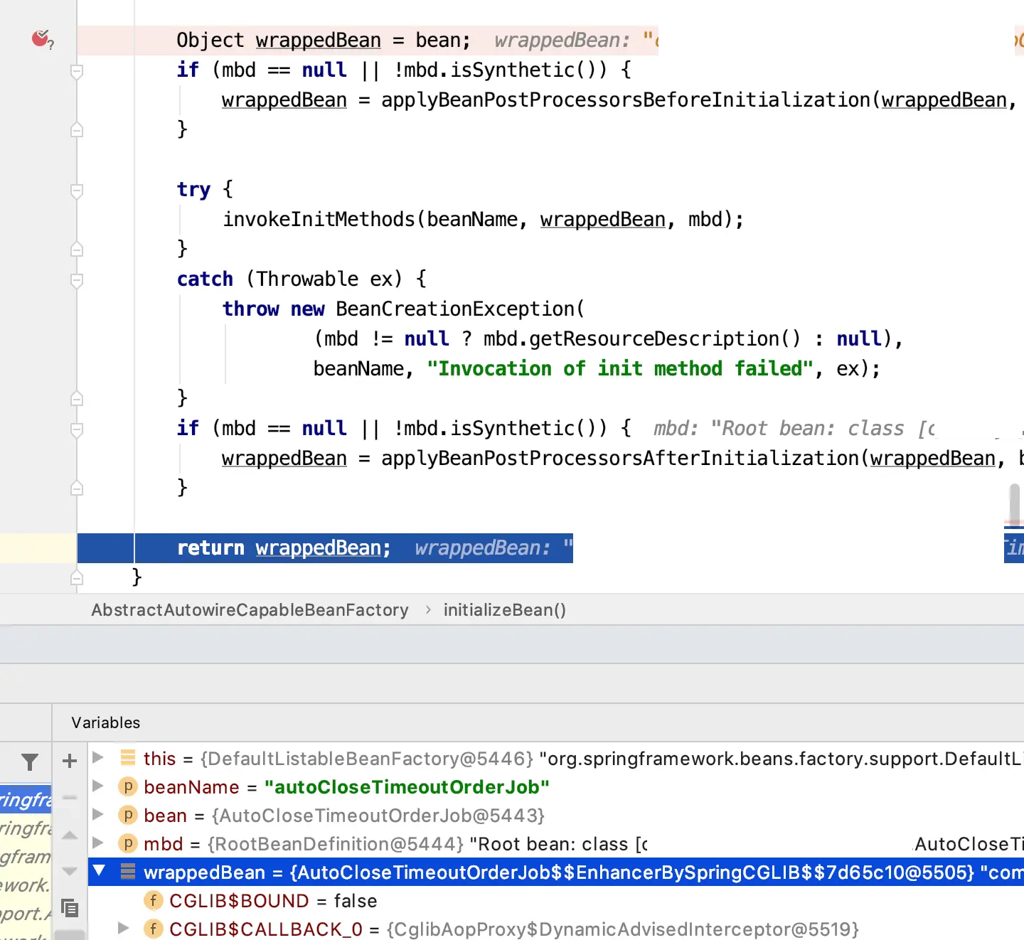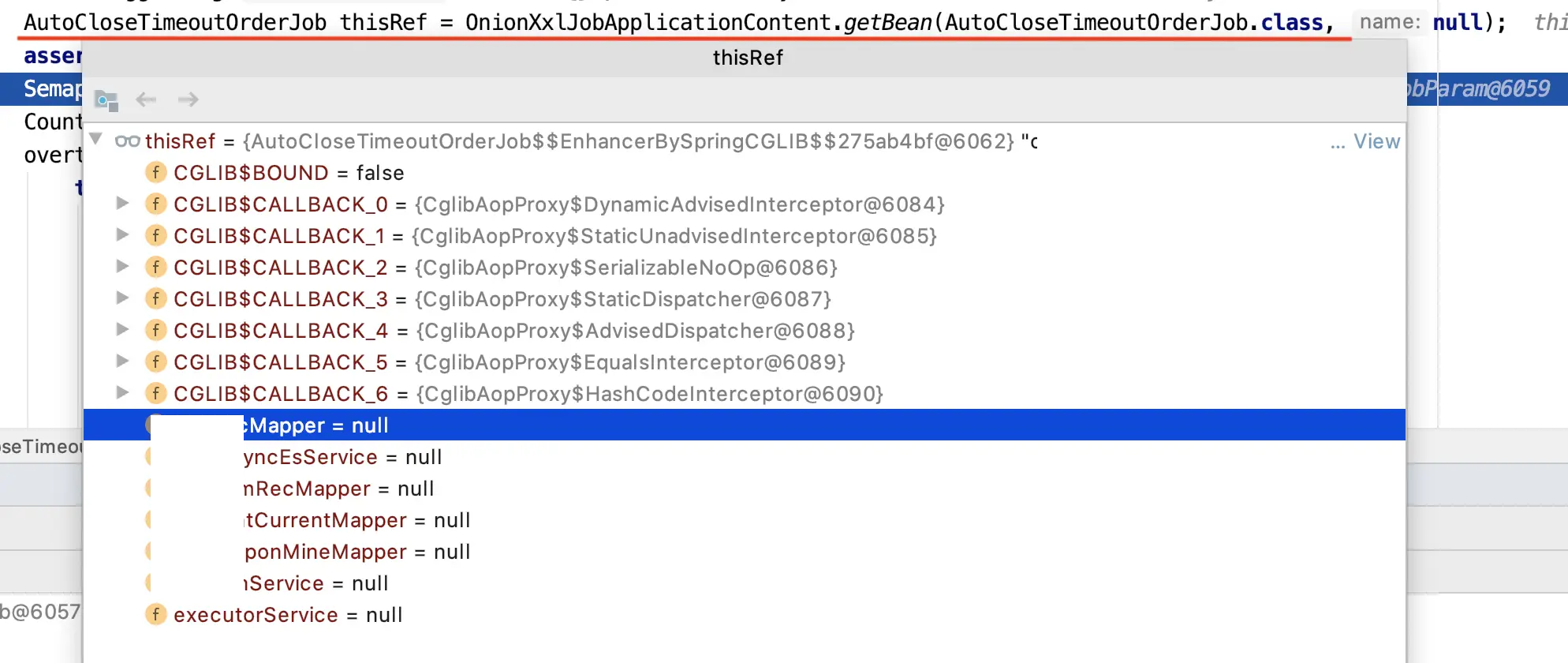 图中AutoCloseTimeoutOrderJob实例的字段都为空,这些字段都是自动注入的Mapper与Service,不可能为空。但从调试结果我们可以看出,从bean工厂获取到的是AutoCloseTimeoutOrderJob的代理对象,并非AutoCloseTimeoutOrderJob。
