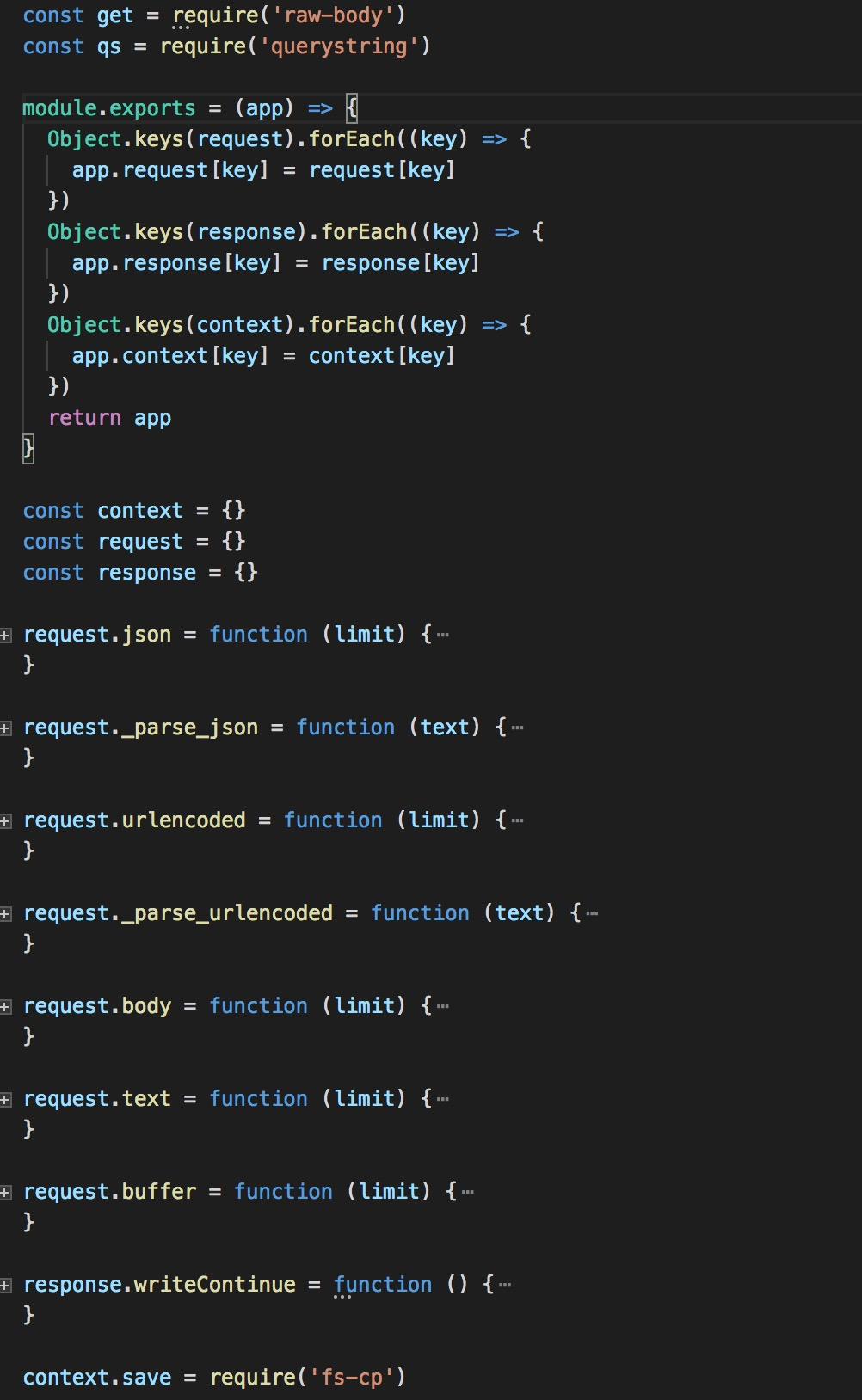 从代码结构可以看出,koa-bodyparser向外暴露一个方法,方法中会在app的request属性和respons,context属性上添加一系列方法: