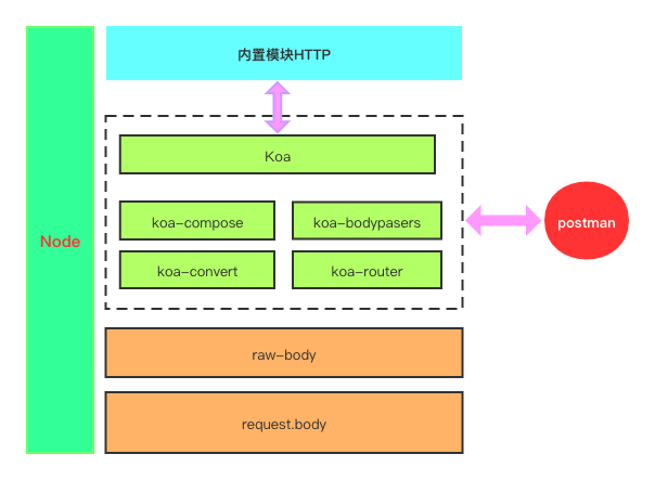 通过koa创建node服务,发起一个post请求,内置模块http处理了很多上游的东西,下游的koa中间件把http body的二进制流根据content-type类型,调用对应的适配器转换成json对象,然后放到ctx.request属性上。