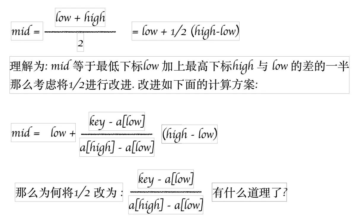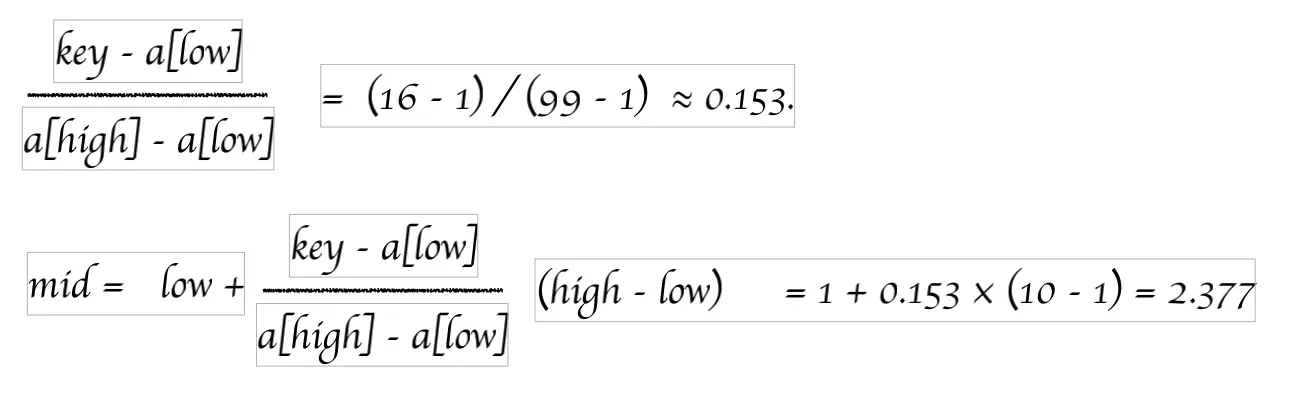 mid = low + (high - low) * (key - a[low]) / (a[high] - a[low]);
