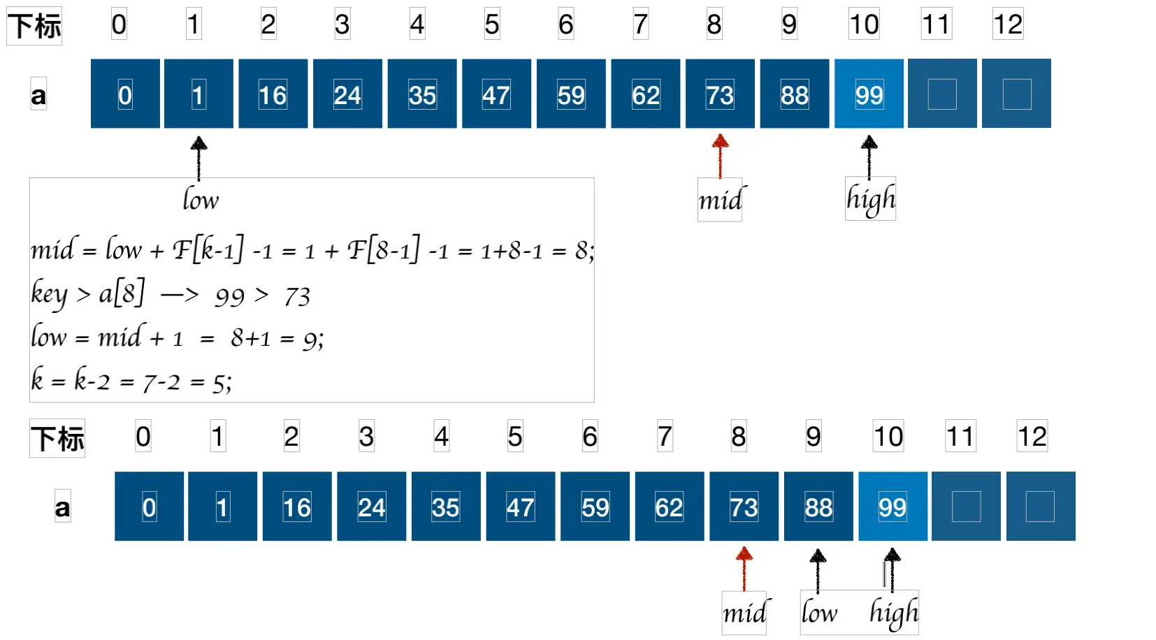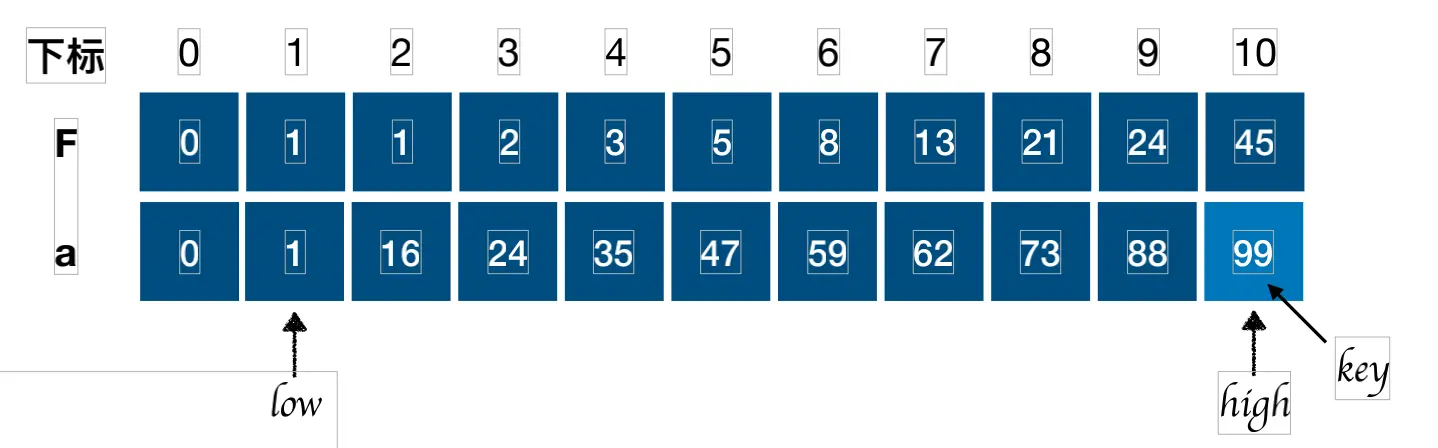 假设,a[11]={0,1,16,24,35,47,59,62,73,88,99},low=1,hight=10;则a[low]=1,a[high]