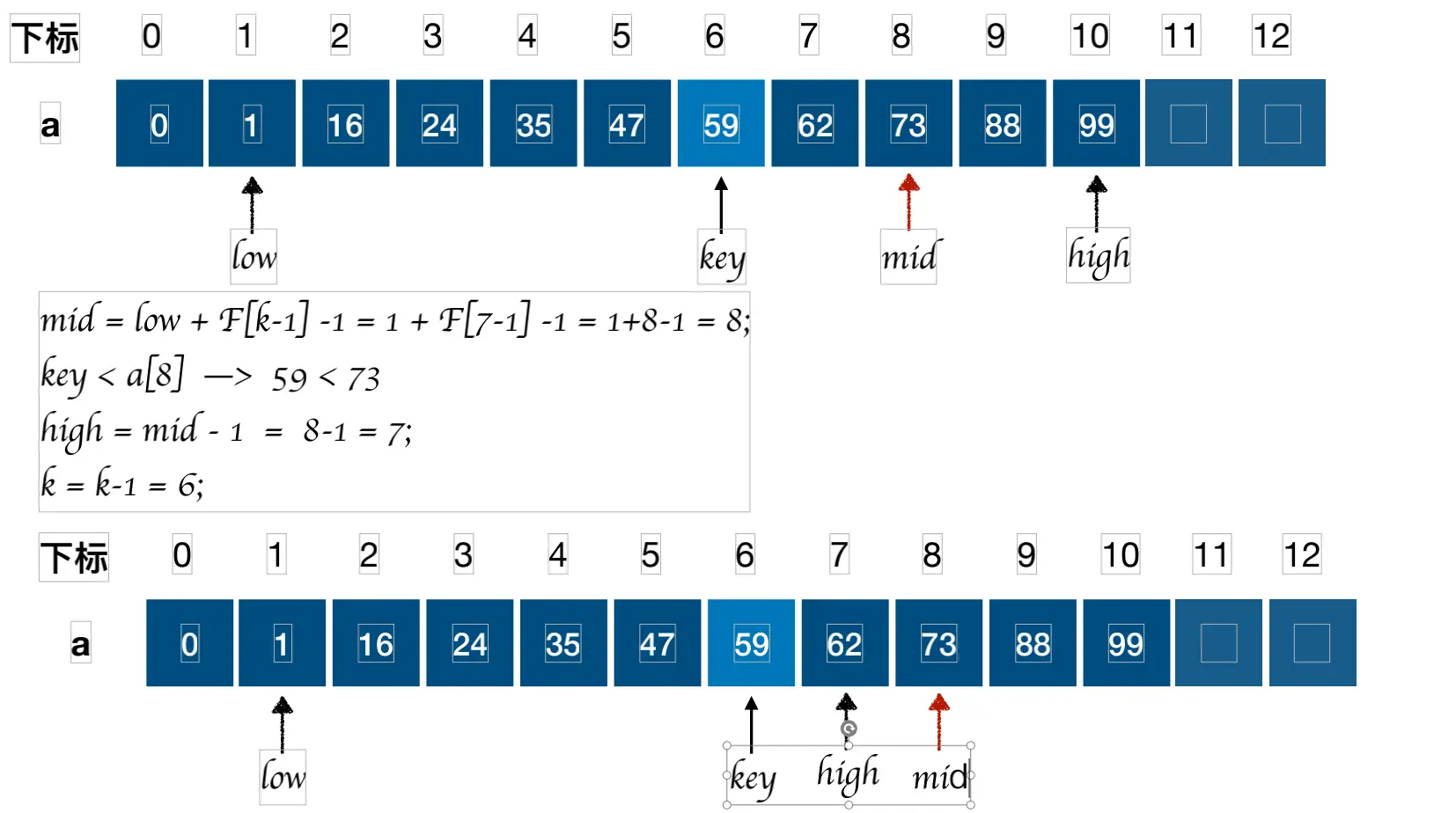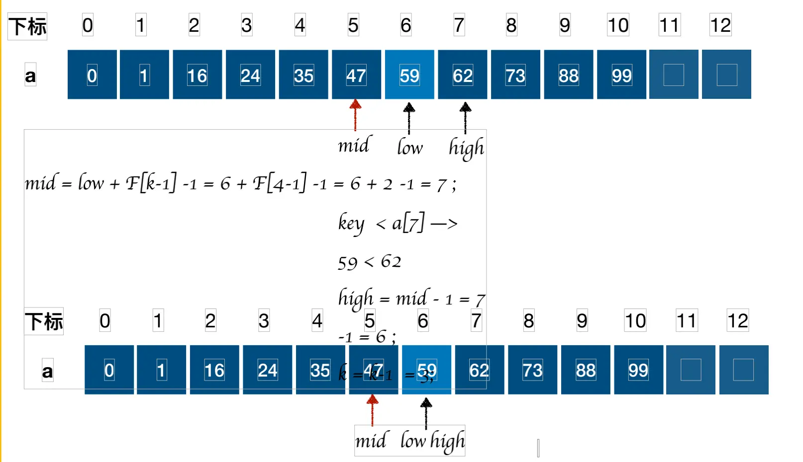 //若key比a[mid] 小,则将最高下标调整到中位下标小一位;