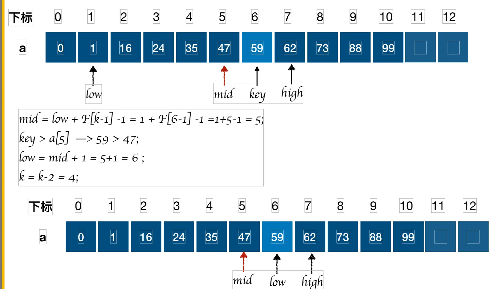 //若key比a[mid]插值 大,则将最低下标调整到插值下标大一位;