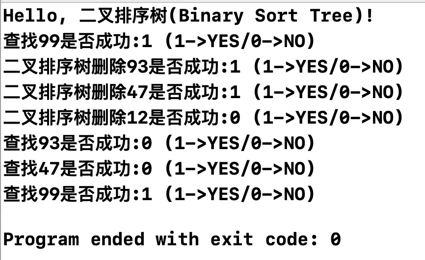 printf("二叉排序树删除93是否成功:%d (1->YES/0->NO)\n",statusValue);