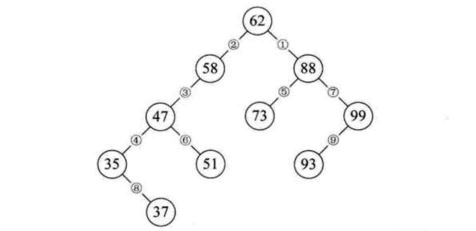 下面我们通过一个示例,来看看二叉排序树的操作。首先,我们把集合{62,88,58,47,35,73,51,99,37,93}按照二叉排序的规则生成一棵树。结果如下: