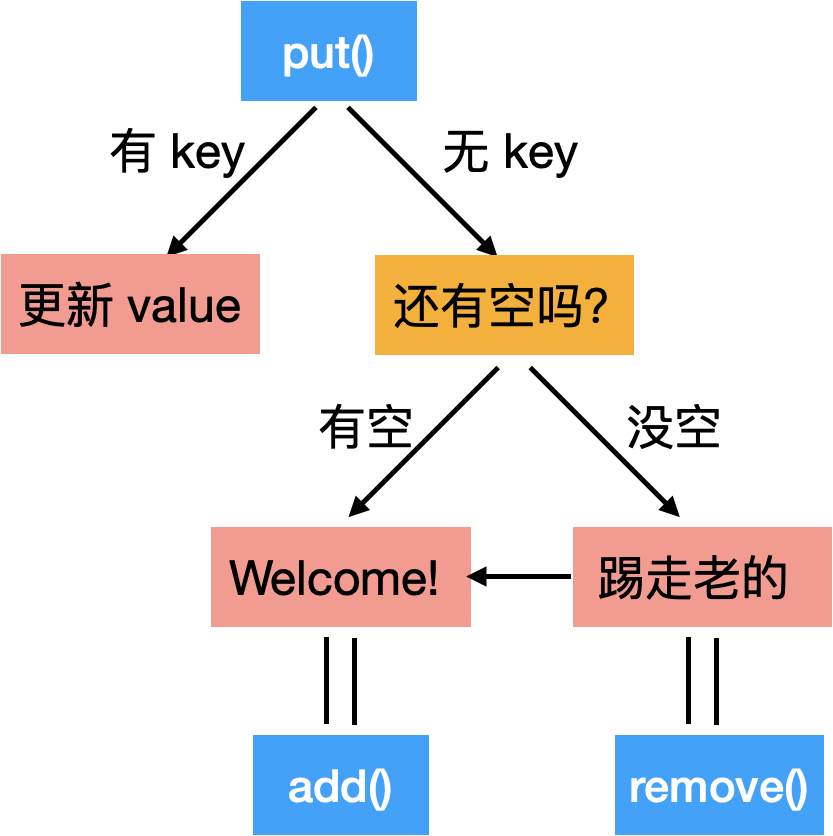 - “踢走老的”这里我也是用一个单独的 remove() method 来写的。