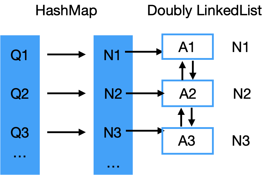 LinkedList,有点可以哦,按照从老到新的顺序,排排站,删除、插入、移动,都可以是 O(1) 的诶!但是删除时我还需要一个 previous pointer 才能删掉,所以我需要一个 Doubly LinkedList.