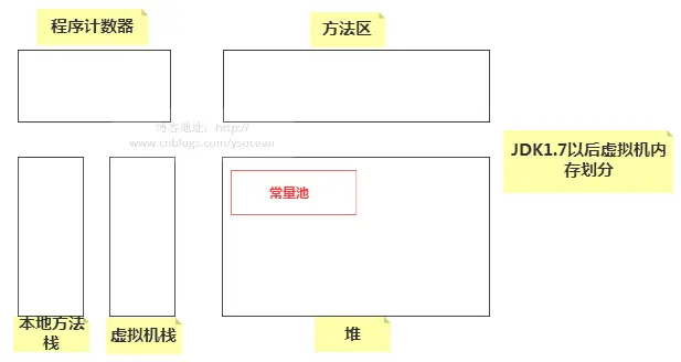 在 JDK1.7 以后,方法区的常量池被移除放到堆中了,如下: