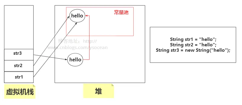 String str3 = new String("world");//new 关键字只会在堆中创建对象