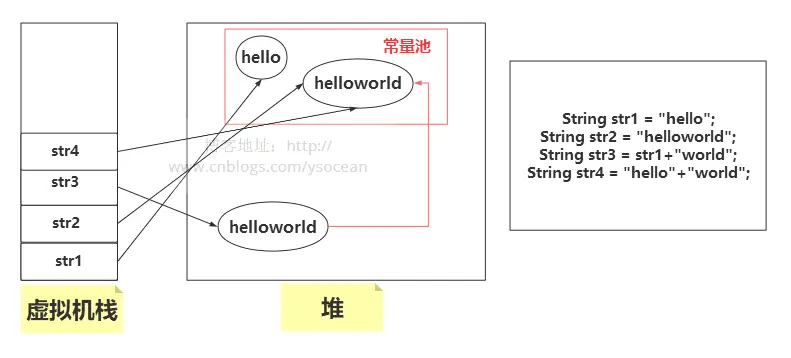 String str3 = str1+"world";//编译器不能确定为常量(会在堆区创建一个String对象)