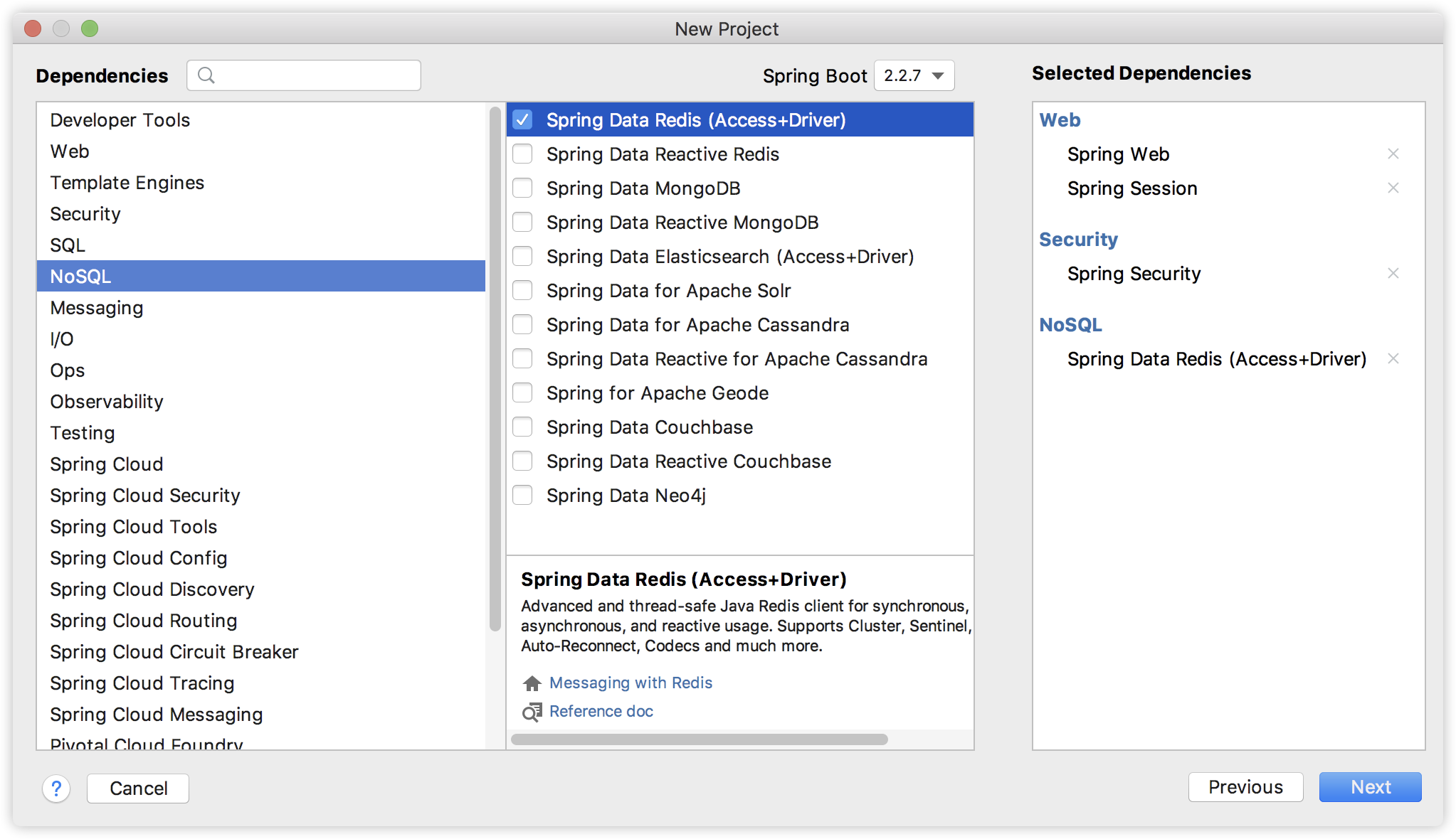 首先 创建一个 Spring Boot 工程,引入 Web、Spring Session、Spring Security 以及 Redis: