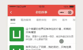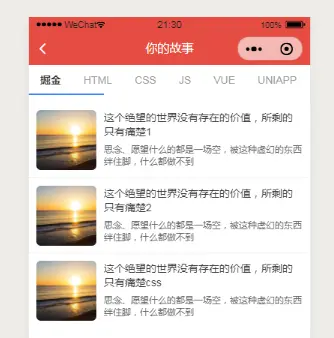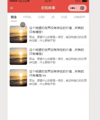 因为项目做的是博客demo, 首页进来想给人直观的就能看到文章,看到分类。所以想的一个是可以左右滑动,切换分类,一个是页面以列表形式,直接 list 渲染。类似掘金的样式: