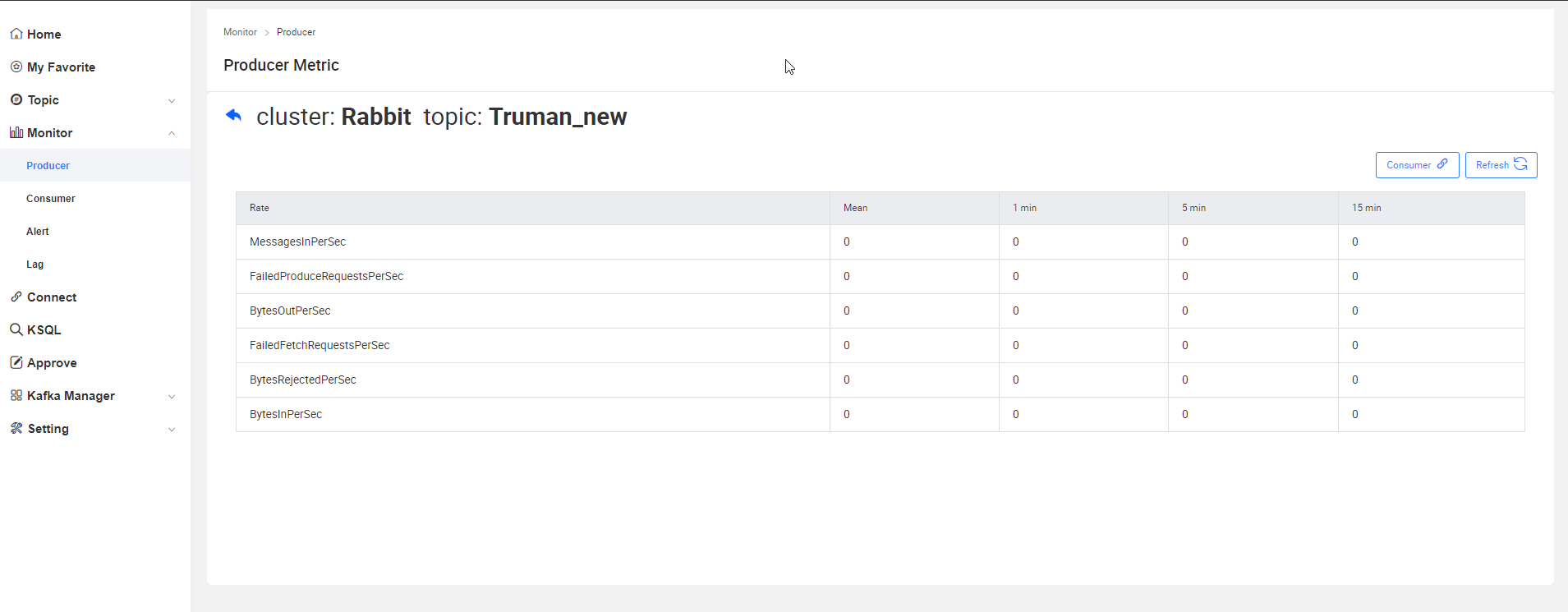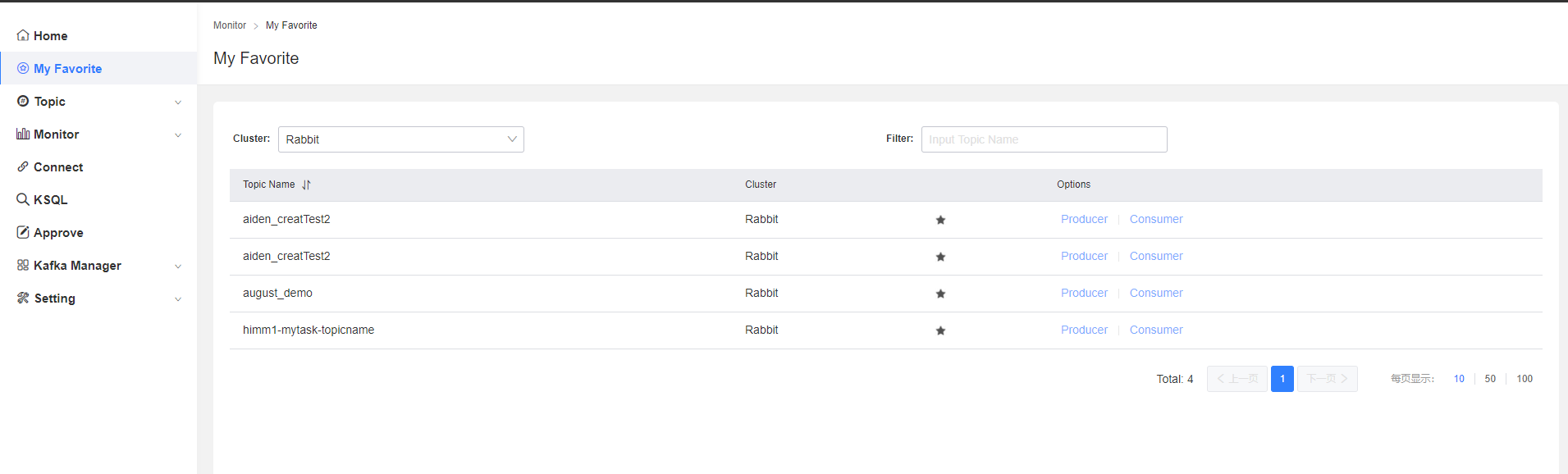 用户可以在此模块完成Topic查看,已经申请新建Topic,同时可以对Topic进行生产消费测试。
