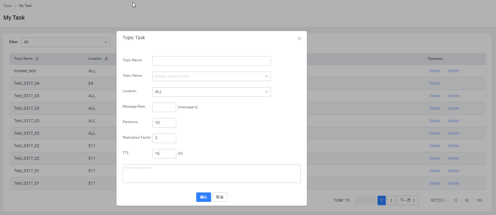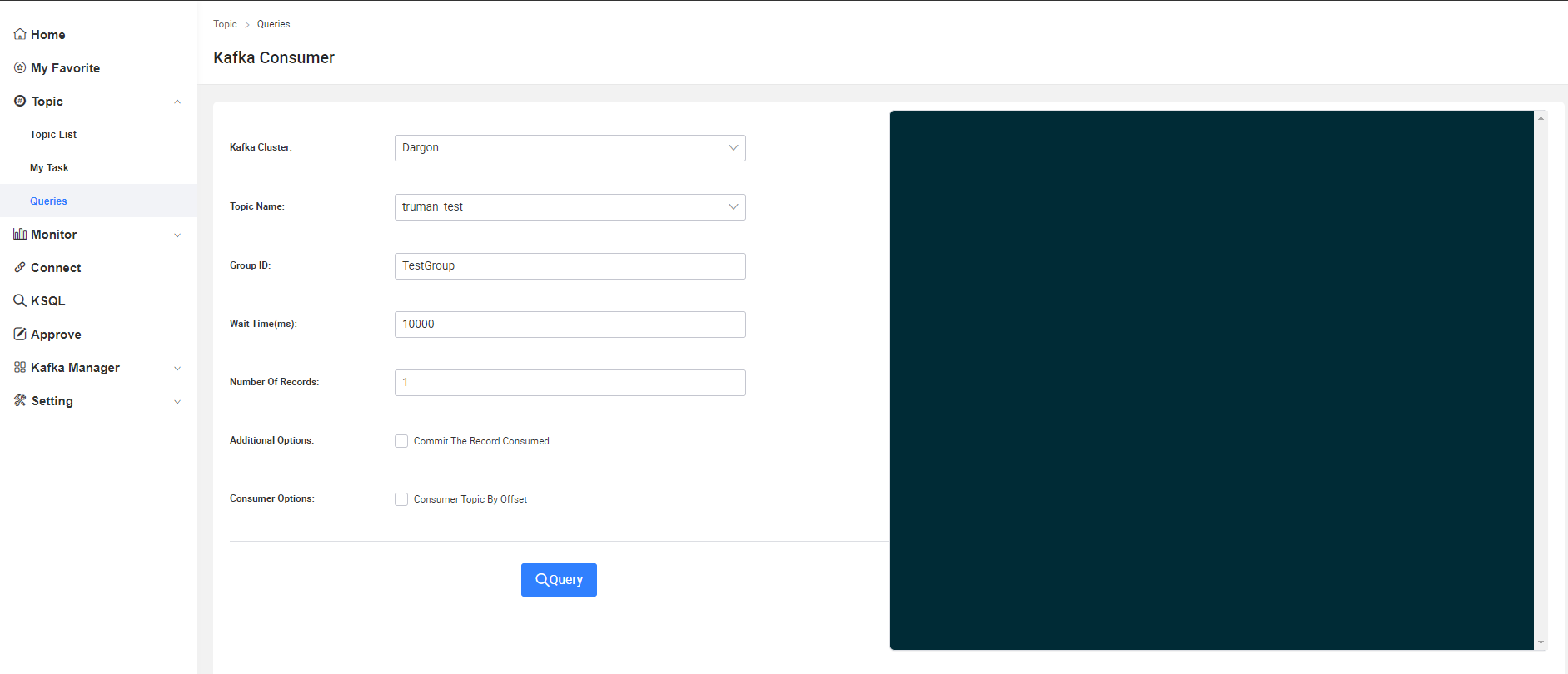 - Topic-> 用户可以在此模块查看自己的Topic,发起申请新建Topic,同时可以对Topic进行生产消费测试。
