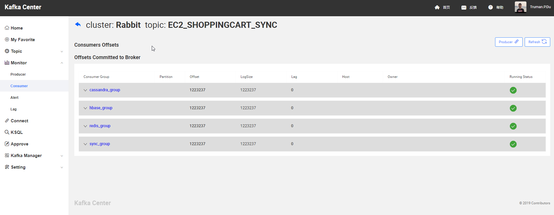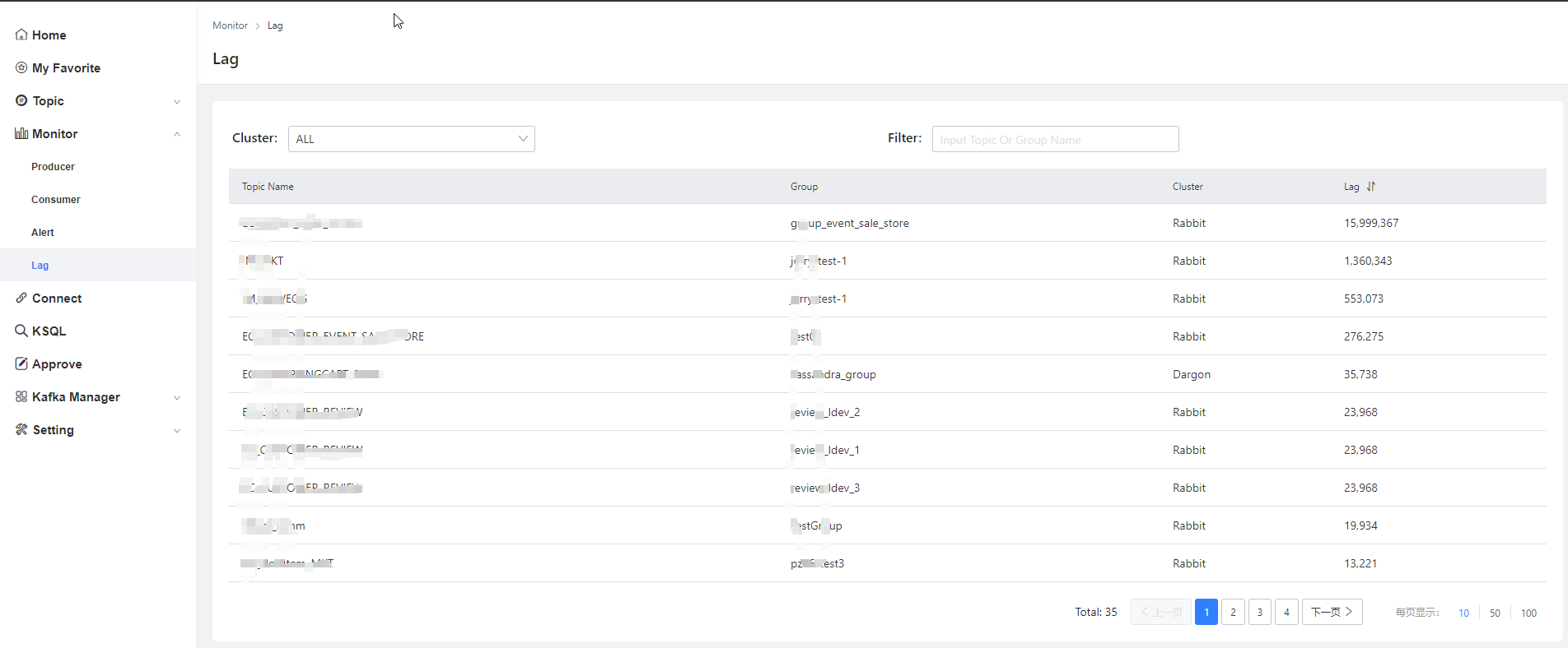 用户可以在此模块中可以查看Topic的生成以及消费情况,同时可以针对消费延迟情况设置预警信息。