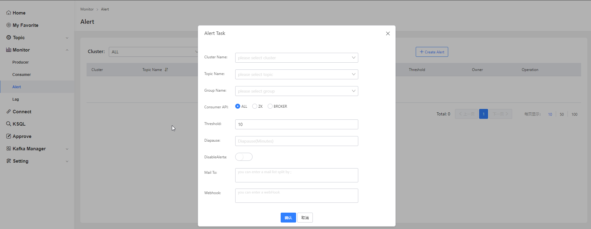 - Monitor-> 用户可以在此模块中可以查看Topic的生产以及消费情况,同时可以针对消费延迟情况设置预警信息。