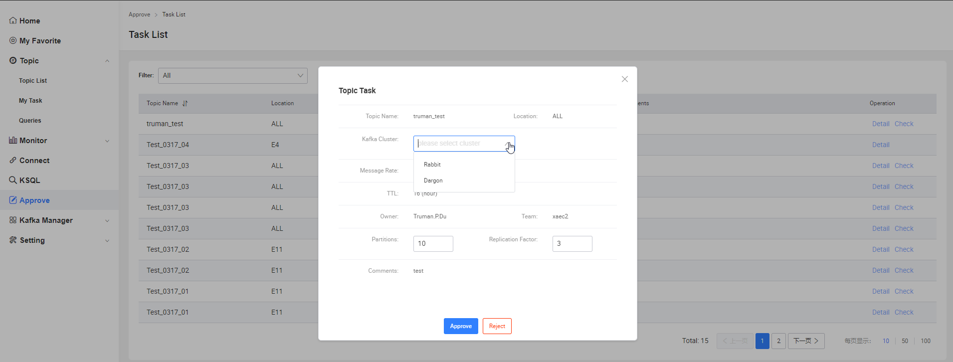 - 审批通过:Topic将会被创建在管理员指定的集群