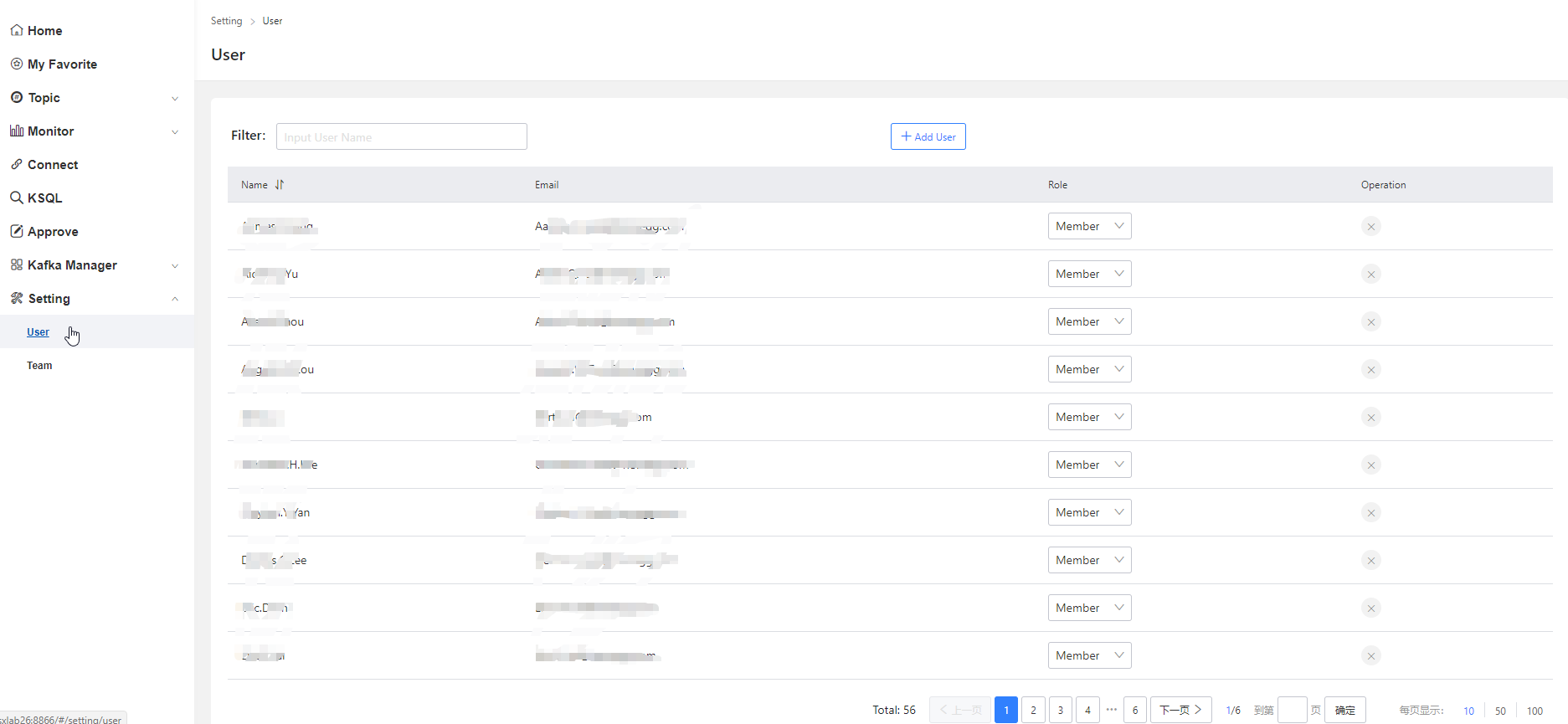 - Setting-> 此模块主要功能为管理员维护User、Team以及kafka cluster信息