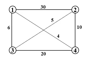 某售货员要到若干城市去推销商品,已知各城市之间的路线(或旅费)。要选定一条从驻地出发,经过每个城市一遍,最后回到驻地的路线,使总的路程(或总旅费)最小。本文只考虑4个城市的情况,下面这个带权图即为问题的转化。