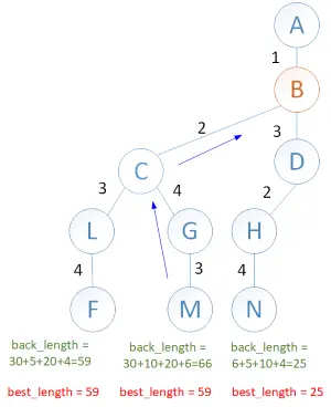 可以看到此时搜索的路径为12431,算上M->A路程总和为66,此时路程总和是大于最优解的,所以最优解仍为59,而节点C所有孩子节点搜索结束,那么需要向上回溯到C的祖先节点B。