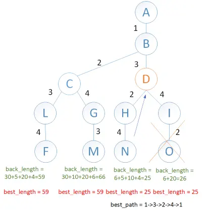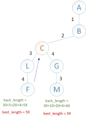 首先已知售货员于城市1起步,第一步可以画下任意一条可行解,不受任何约束,上图的路径为12341,算上F->A路程总和为59,这也是当前的最优解。由于L只有F一个孩子节点,那么只能回溯至C节点,因为C还有另一条路径可供搜索。