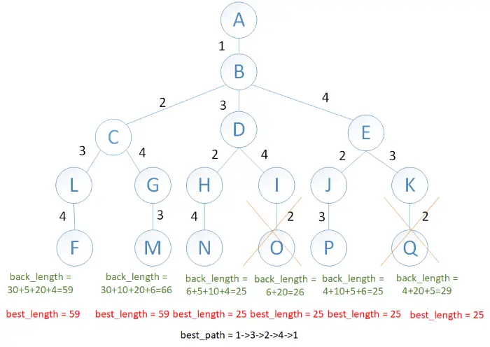 - 当t<=n时,即当前扩展节点位于第t-1层:如果在t-1层的扩展节点与在t层的扩展节点之间有路径存在,并且[1:t]对应路径的路程总和小于最优解,则向下继续搜索,否则进行剪枝。