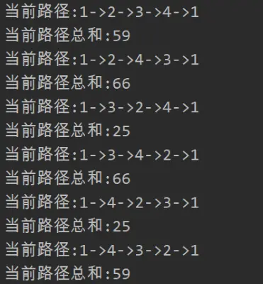 可以看到上面代码中的循环都是从1开始,这也是为了与上文二维数组中的地图索引相对应。最后运行程序可以得到每条可行路径及其对应路程总和。