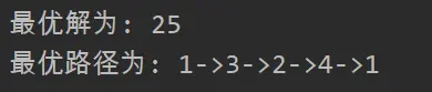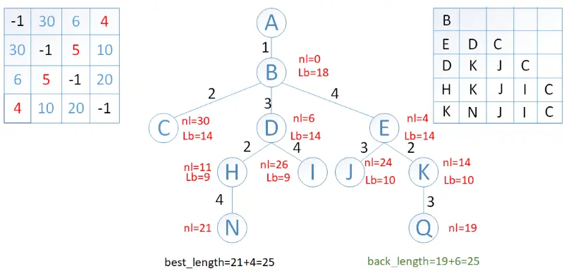 自此活节点表中没有节点优先级高于N,所以节点N对应的路径13241成为最优路径,对应的路程总和25成为问题的最优解。