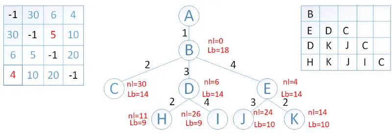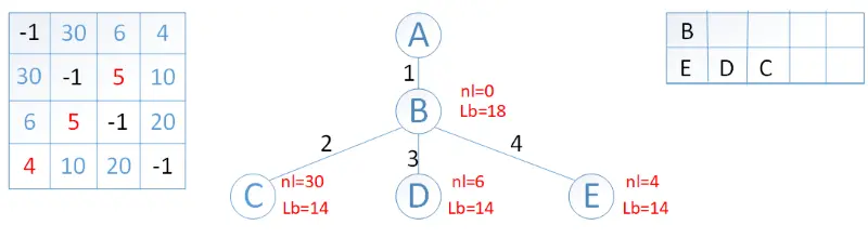 左上角为图的邻接矩阵,右上角为活节点表,当扩展节点为B时,他需要一次性产生自己的所有子节点。可以看到B出的Lb为18,这个18怎么得到的呢?就是每一行或者每一列除-1之外最小权值相加,即4+5+5+4=18。下界通常不是一个可行解,但是它为可行解提供了一个界定,方便找出最小消耗的那条路径(最优解)。
