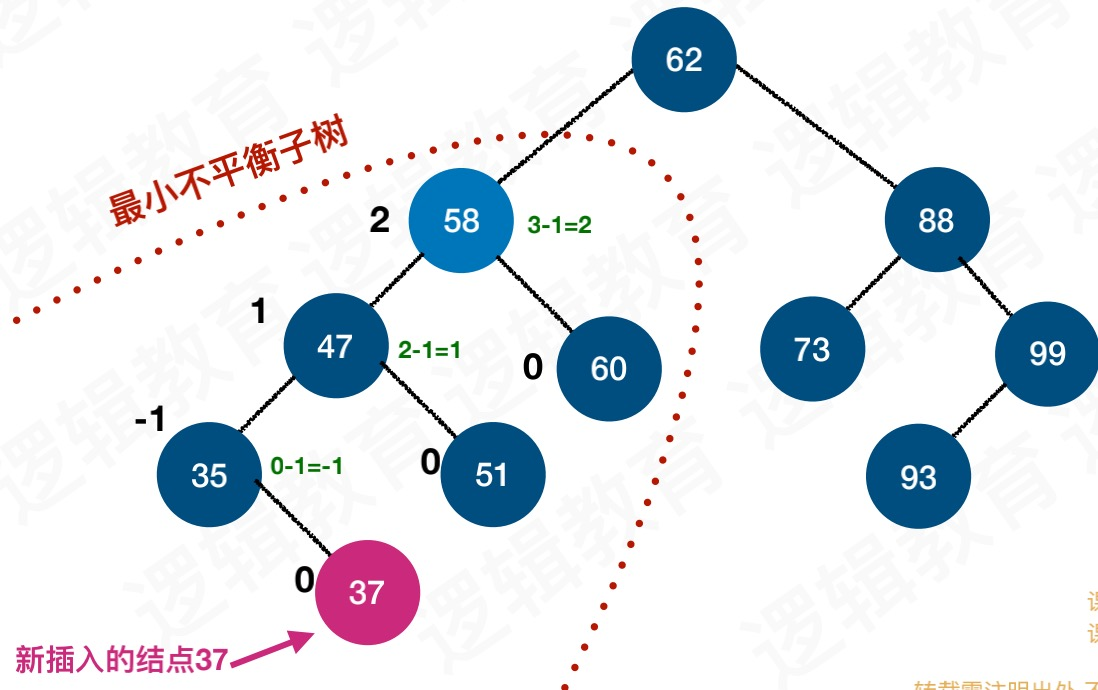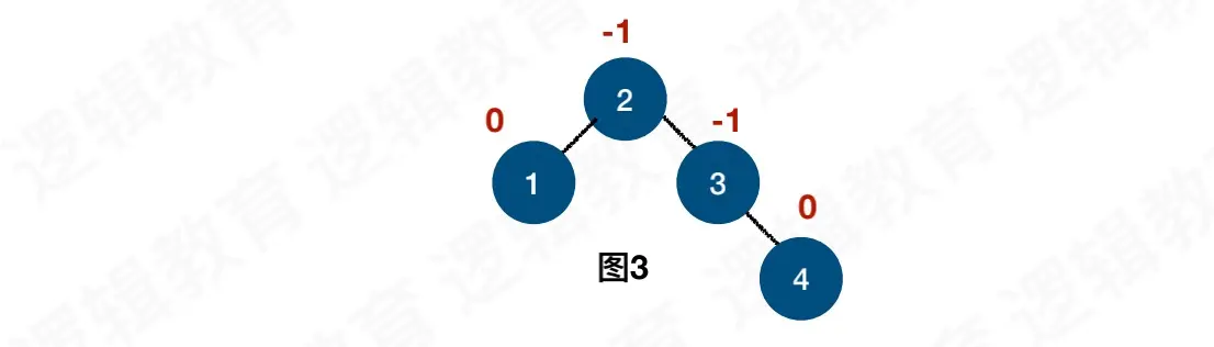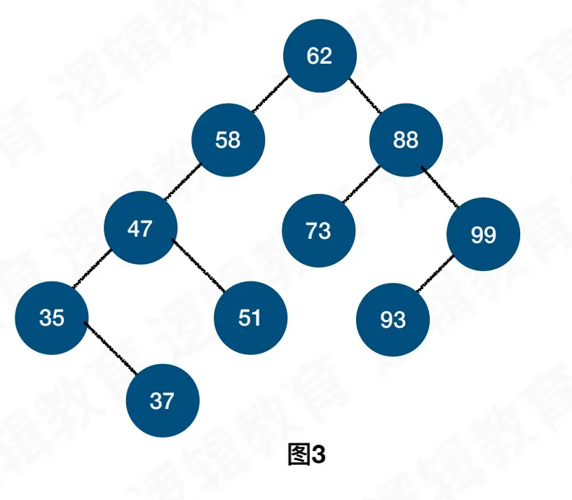 图3也不是平衡二叉树,因为58节点的平衡因子BF为3,它大于1,所以不是