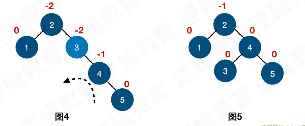 插入5节点,由于3节点(是最小不平衡子树)的BF值为-2,绝对值大于1,所以3节点左旋转