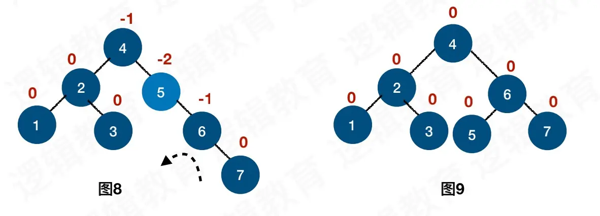 插入7节点,导致5节点的BF为-2,所以5节点左旋转