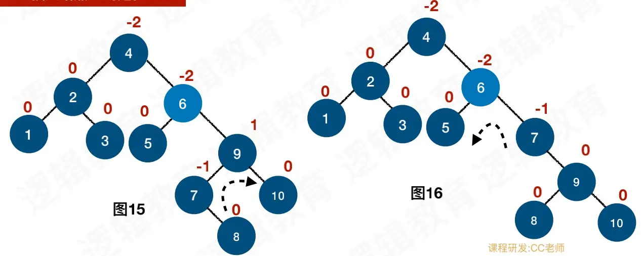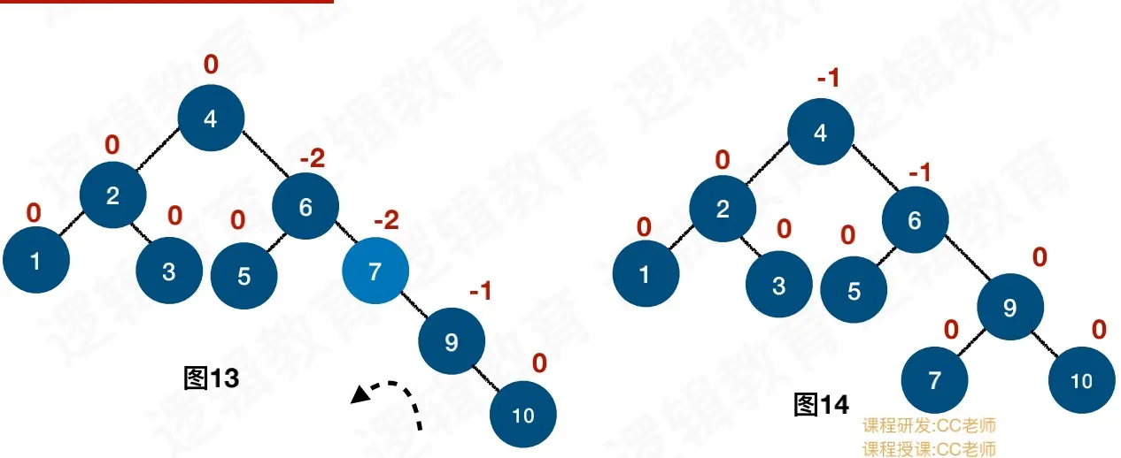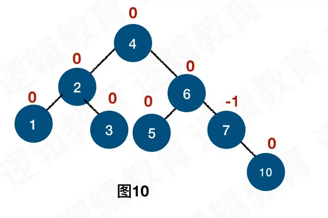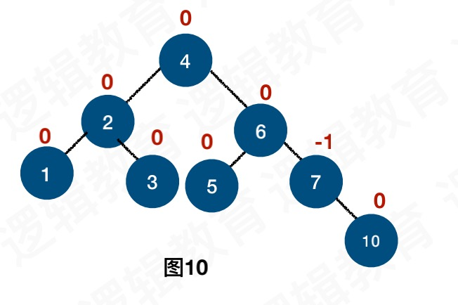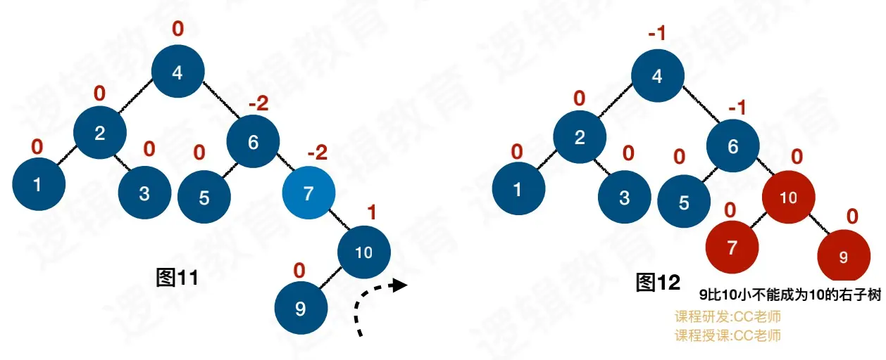 插入9节点,会导致7节点BF为-2,10节点BF为1,此时我们不能直接将10节点右旋转