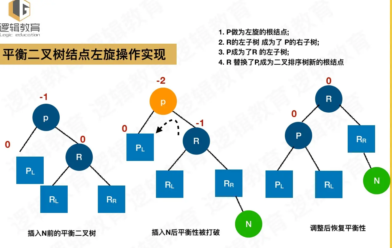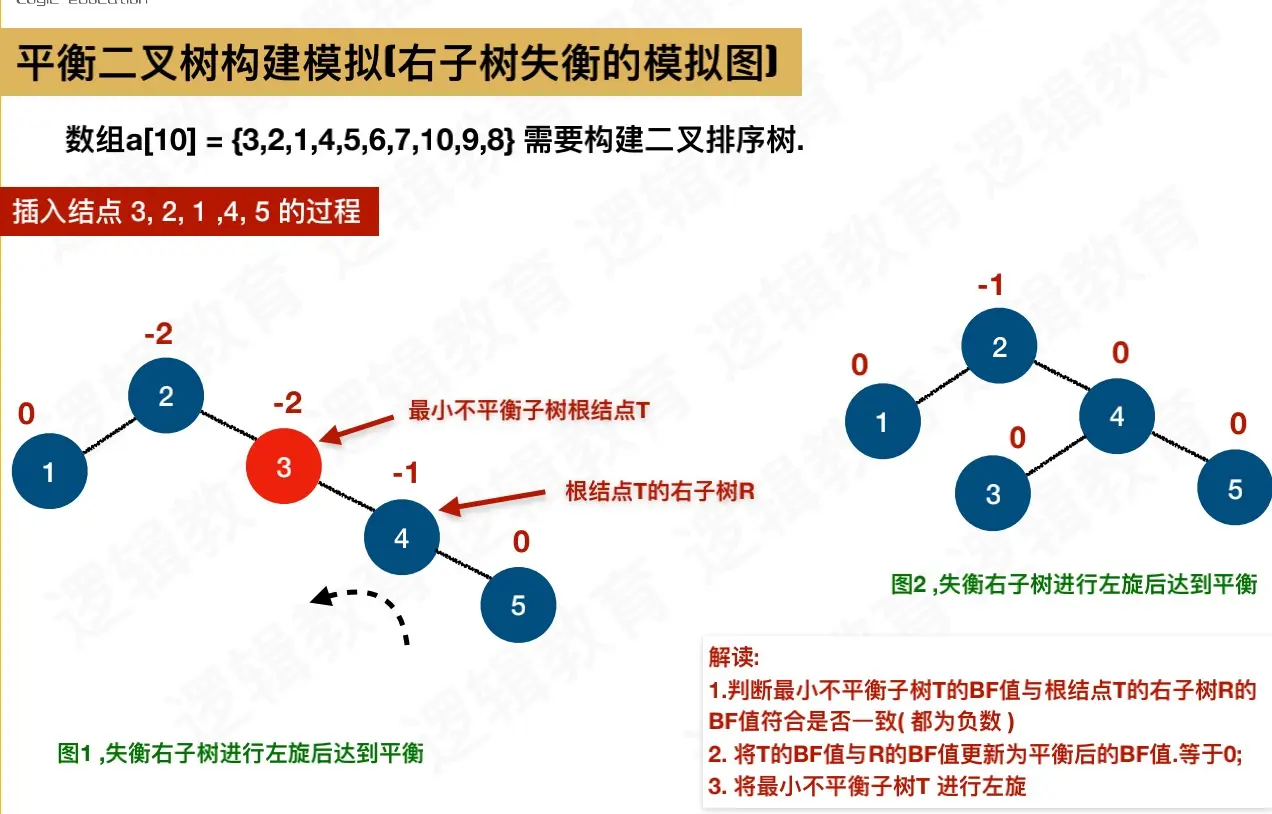 在构建二叉排序树的过程中,每当插入一个新的节点就要判断新插入的节点会不会破坏树的平衡,如果会则找到最小的不平衡子树,在保持二叉排序树的前提下,调整最小不平衡树中各节点之间的连接关系,进行相应的旋转,使之成为新的平衡子树。