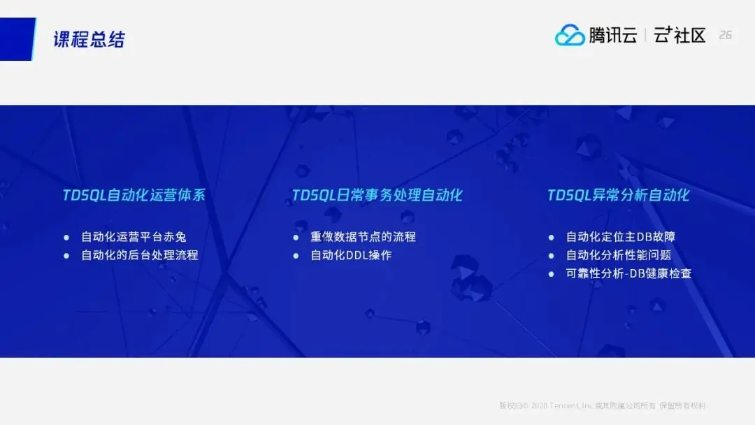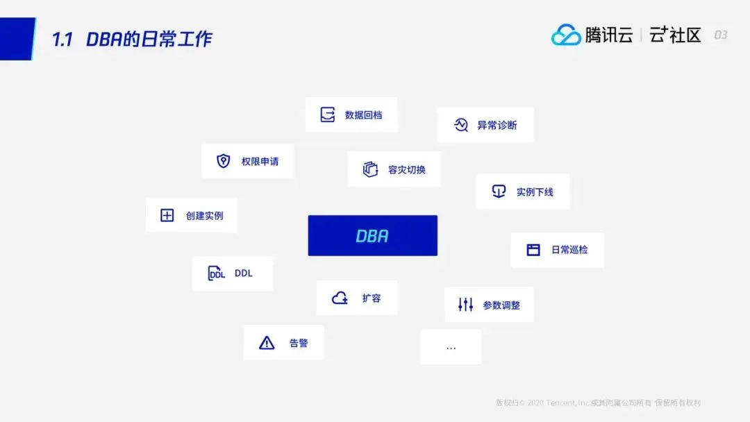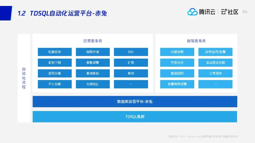 总结而言,TDSQL自动化运营体系可以帮助大家把日常中非常烦琐、需要手动操作的事情进行标准化、自动化、智能化,一键完成,减轻大家的负担。因为我们做了标准化沉淀,很多需求不需要DBA自己做,基于TDSQL运营平台,业务也可以直接解决。日常的一些操作可以通过赤兔的权限管理放开给业务。