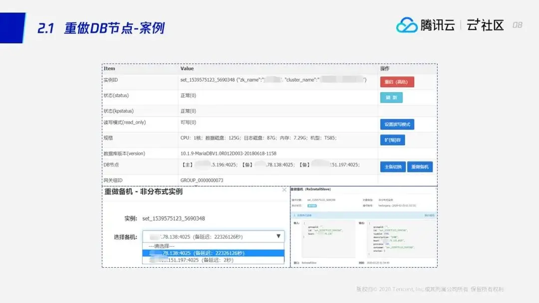 第一节重做DB节点。大家可能会想为什么重做DB节点?这个场景比较常见,虽然它不是每天都发生,但是它隔一段时间就会发生,而且这个事情也是比较重要的。比如机器故障了机器修复可能需要一点时间,机器修复之后需要重新加入集群,数据可能就丢失;或者数据非常旧,已经追不上了,我们需要对这个数据节点进行重做;另外,如果卡顿无法恢复了我们就需要对数据节点进行重做,恢复节点的功能。