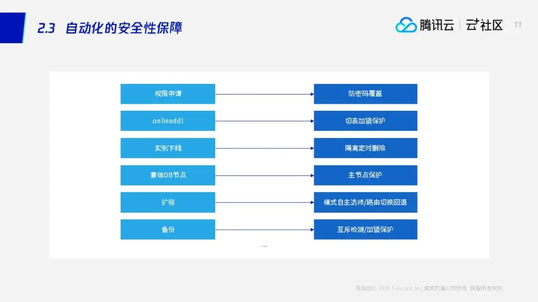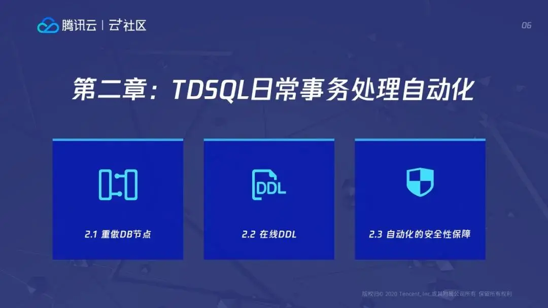第一是重做DB节点功能,第二个是在线DDL功能,第三是TDSQL在自动化流程里如何做安全保障。