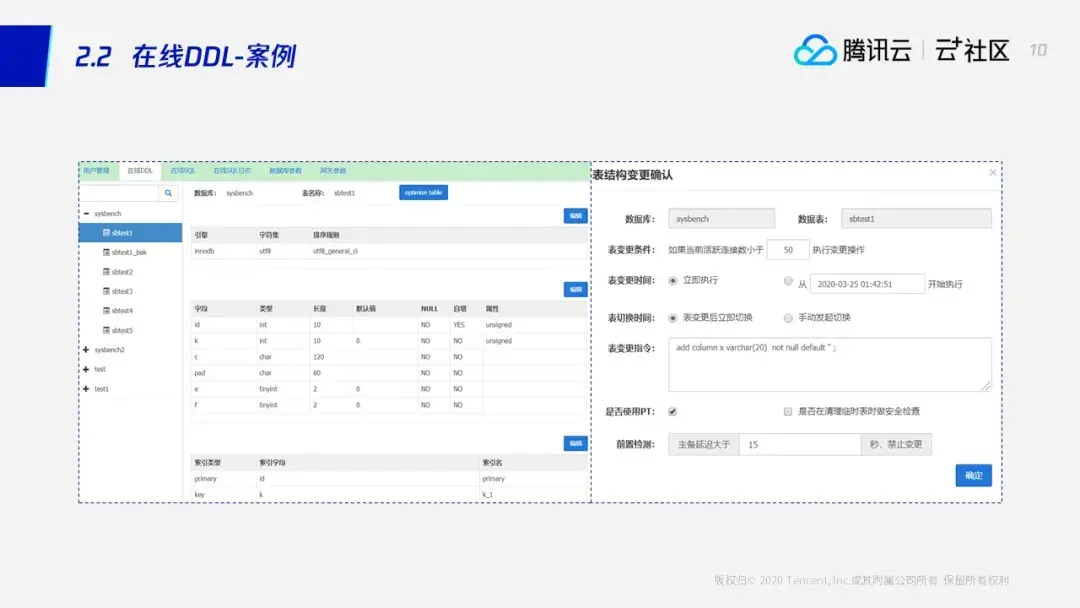 左图就是在线DDL页面,通过页面可以看到表结构,大家点击“编辑”按钮就可以修改字段和索引。右图的页面里面我们可以看到,刚才提到的参数设置都可以自定义,也可以选择默认值,点击“确认”后整个过程自动完成。如果选择手动切表,可以选择合适的时间完成切表操作。