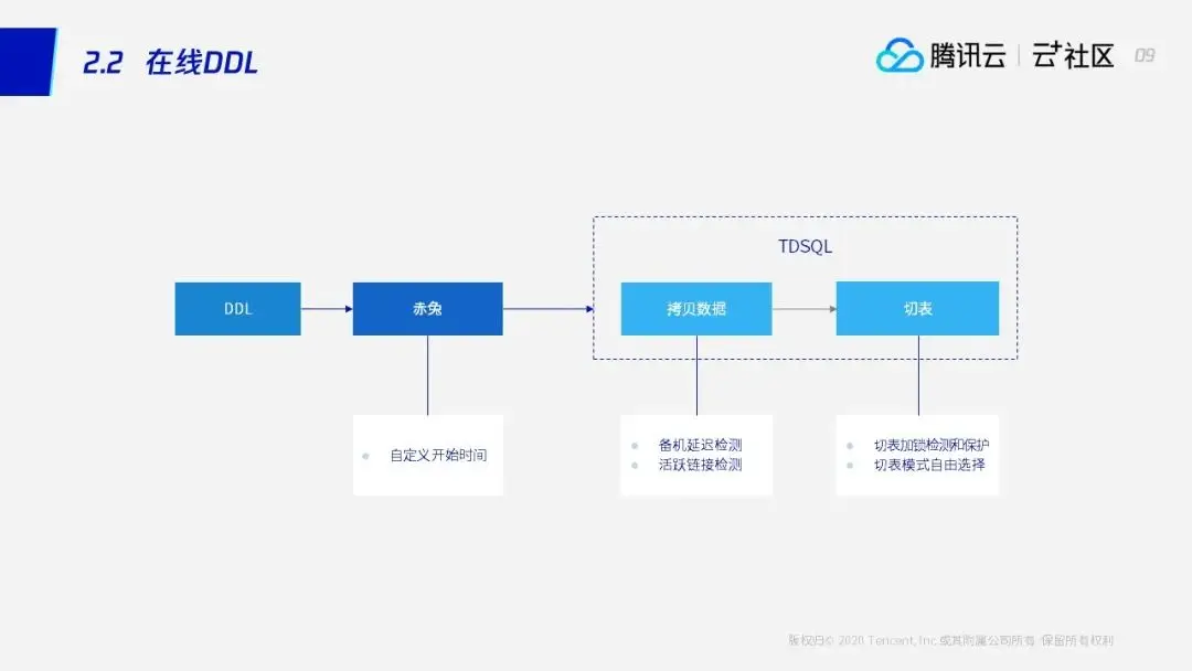 TDSQL在这个流程里做了哪些事情?赤兔可以自定义DDL的开始时间。那为什么要做这个事情?DDL虽然是在线,但是也会涉及到拷贝数据,特别是在业务负载比较高的时候会对业务有影响,我们希望在业务不繁忙的时候——业务一天里的周期一般是固定的,即在业务低谷的时候做这个事情,因此平台支持可以自定义时间,比如白天发起任务,晚上一点钟业务低估时再正式运行任务。