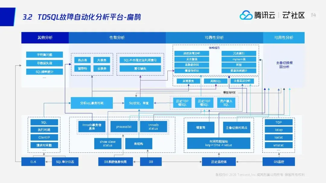 所以这个图有三个核心模块来处理日常的流程:一个是扁鹊,这个是问题分析模块。onlineddl处理DDL请求,以及TDSQL各个模块后面的角色以及任务的处理。TDSQL自动化运营流程和框架就介绍到这里。