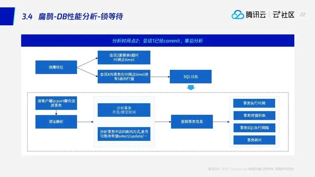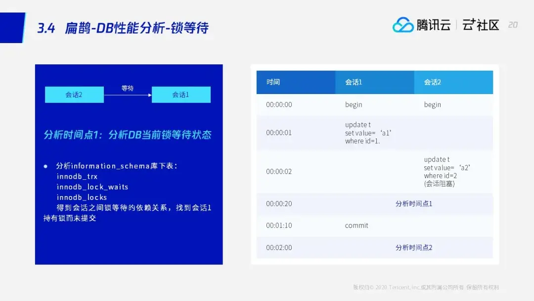 第二个时间点,会话已经提交了,会话2时间比较久,在提交的一瞬间SQL就执行成功了。会话2整个已经超时,时间点二业务场景下1个小时之前会话超时了,赶紧看一下当时是什么情况。时间点1非常简单,熟悉DB的比较了解这种方法,底下有表就是事务表、锁等待表,通过关系我们可以查出来会话1没有提交,把会话2给堵塞了,所以这种场景最容易分析。平常做把三个表的关系记录一下去查询,看看到底是哪个会话有问题然后把会话1杀掉,在业务看一下是不是有问题。