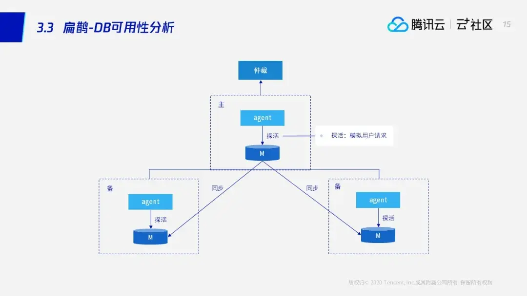 TDSQL分布式数据库通常是一主两备的架构,TDSQL的Agent会周期性地对DB做探活。探活是指模拟用户的请求,建立TCP连接后然后执行查询和写入,比如监控表的查询,模拟用户的请求看是否正常。TDSQL的可用性在于探活异常,如果认为DB发生异常,就会自动发起切换流程。
