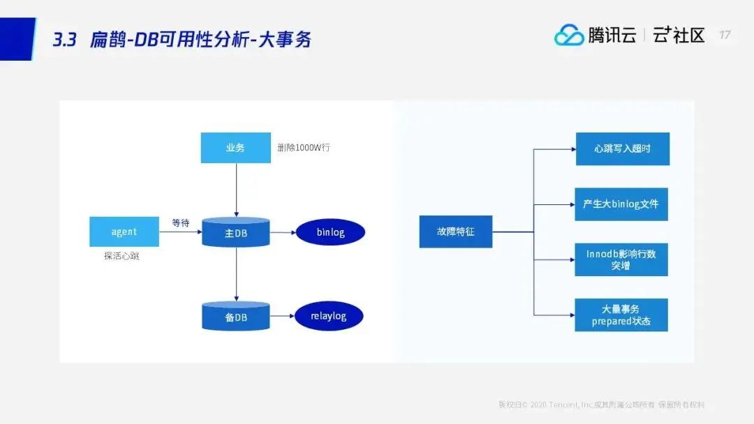 我们分析主DB的请求,刚才提到了有Agent负责探活心跳周期性,同时也会有业务的请求——假设这个地方一个大表删除了1000W行……这些问题TDSQL结合成一个组提交。提交后可想而知会产生很大的binlog,据我们了解的可能会产生5G、10G甚至几十G。因为一个事务必须在一个binlog里,所以非常大的binlog。产生大的binlog又会产生哪些因素呢?整个流程下来会发现耗时非常长。而探活的时候会有时间频率限制,超过时间就会认为失败,探活失败提交了一分钟必然会发生主备切换,因为可能很多心跳已经上报仲裁主DB已经故障。