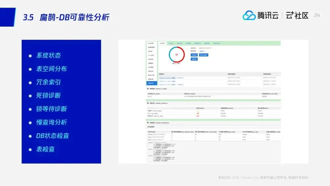 DB可用性分析,是指对数据库的状态可以提前了解,包括:系统状态、表空间分布、索引、死锁诊断、锁等待诊断、慢查询分析、DB状态检查等等。我们可以看到这样的案例:数据库评分非常低,做了分析之后看到它是哪些问题——CPU空间过度?任务非常多?下面的状态信息都可以帮助大家来看DB到底有没有问题,是否可以提前发现问题并解决。