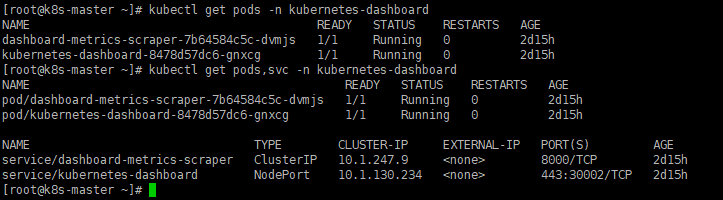 kubectl get pods,svc -n kubernetes-dashboard