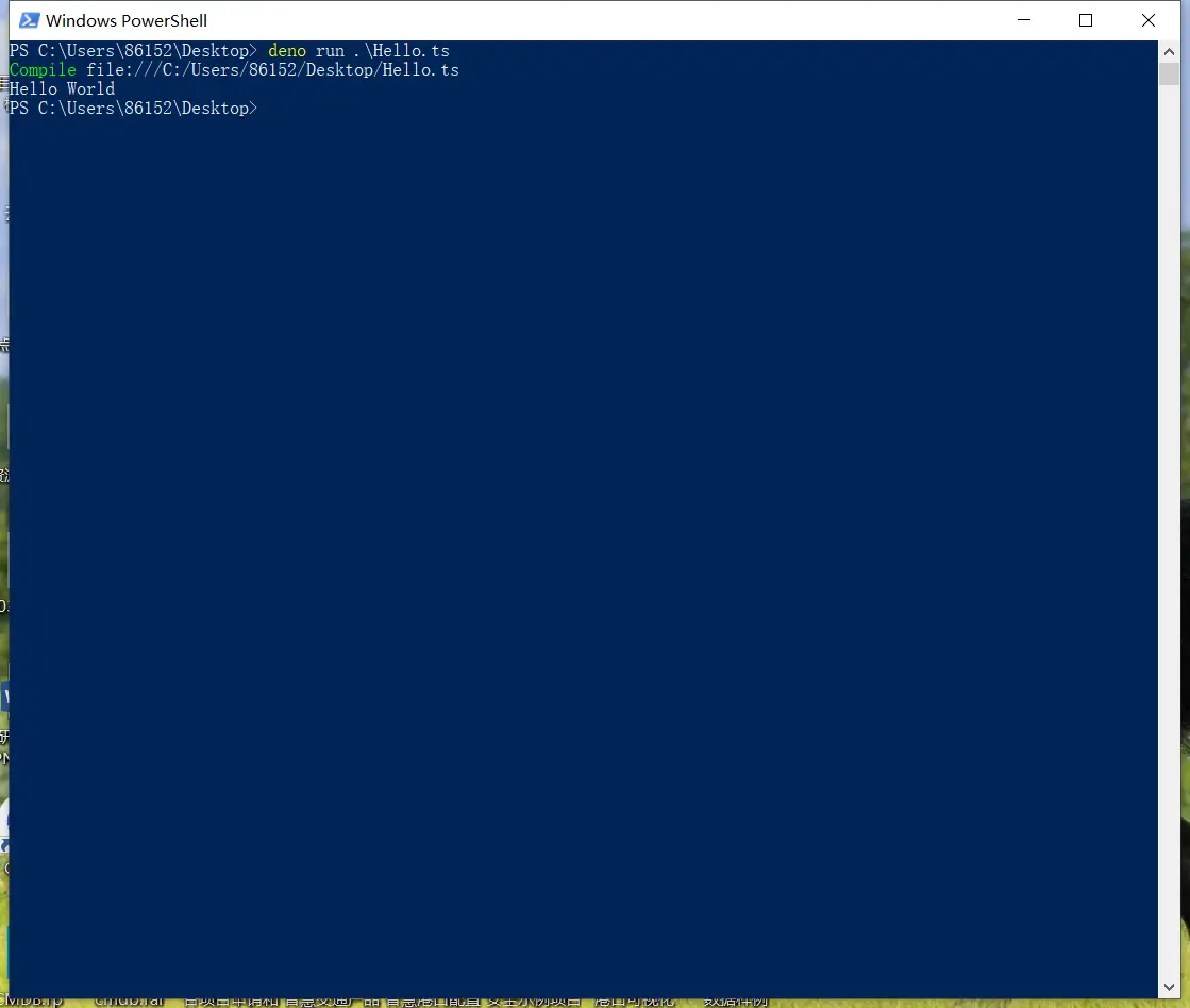 Deno1.0.0_傻瓜教程(2) Hancyang 2020-05-18 174 阅读1分钟 Hello World 1.Hello.ts 新建hello.txt 填写一句console.log('Hello World'),更名为Hello.ts 2.运行 deno run Hello.ts 首次运行会显示Compile,第二次运行则不会继续编译,会直接运行